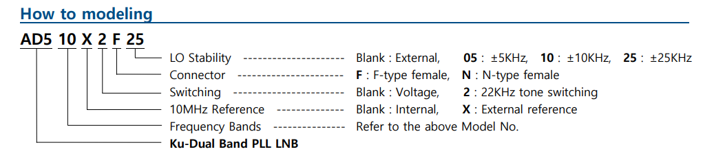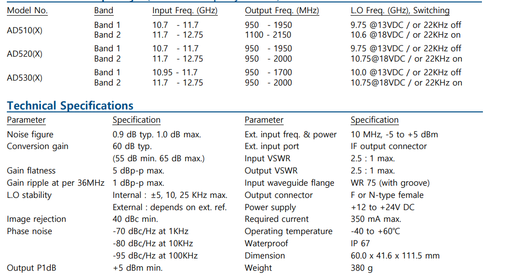 The Atron AD500 Series Ku Dual Band PLL LNB provides a dual frequency band input of 10.7-11.7 GHz and 11.7-12.75 GHz. The Atron AD500 Series Ku Dual Band PLL LNB switches between frequency bands using voltage (13v or 18v).